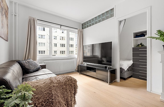 Leiligheten har en godt utnyttet planløsning med en romslig og lys stue, separat kjøkken, sovealkove med plass til seng, skrivebord og garderobeløsning samt et flislagt bad.