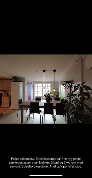 Stort bofellesskapet som holder god standard med nymalte vegger og spenstige farger på alle dører. Her er det god plass for trivelige stunder og felles samvær i bofellesskapets mange sofakroker. Felles to bad har malte vegger, nye dusjkabinett, servant med servantskap. Det ene badet har ny vaskemaskin og ny tørketrommel. 2 felles wc rom med servanter. Stort felles kjøkken med stort spisebord med stoler. Hvitevarer på kjøkkenet : 2 komfyrer, flere kombiskap, oppvaskmaskin.
