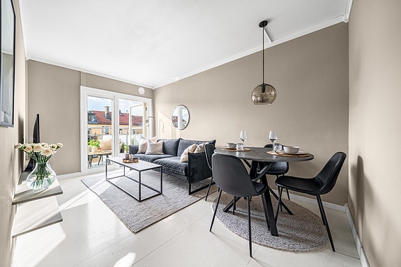 Lys stue med god plass til møblement. Stuen fører ut til balkong.