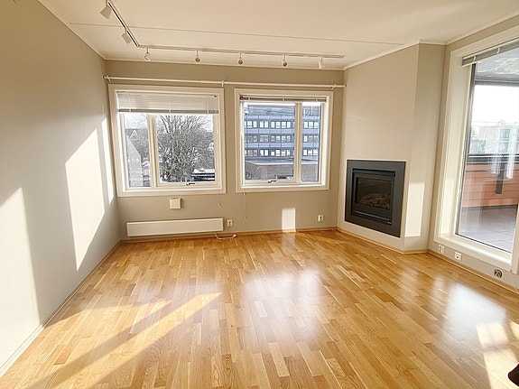 Romslig stue med god plass til både sofa- og spisegruppe. Åpen løsning mot kjøkkenet. Moderne gasspeis i stuen. Fra stuen er det utgang til flott innglasset balkong.