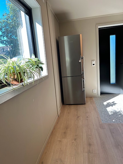 Det er egen inngang med entrémøbel, kjøkken med vanlig komfyr, kjøleskap med fryser, delikat bad med dusj og vask/tørkemaskin, og eget soverom med vindu. På bildene er ikke lettveggen satt opp enda mellom soverom og stue, dette blir gjort før innflytting. Garderobeskap med speil og oppbevaring på hjul som er fleksibel mtp plassering. Varme i gulv på bad og på hele gulvarealet.