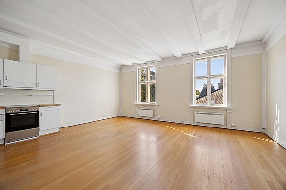 Dette er en lys 2-roms med høy himling og store vinduer.