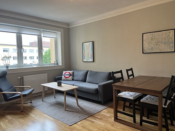 To-roms leilighet (40 kvm) med åpent kjøkkenområde. Separat soverom med 150 cm bred seng med plass til to personer. Arealeffektivt bad og vaskemaskin i gangen. Leies ut møblert som på bildene, med oppvaskmaskin på kjøkkenet.