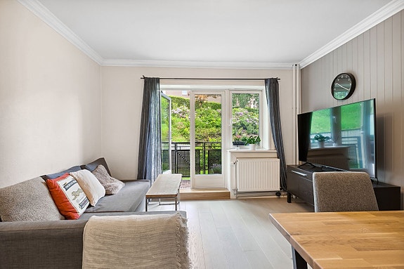 Lys og moderne 2-roms leilighet med en flott og praktisk planløsning, store vindusflater, god takhøyde og god oppbevaringsplass. Fra stuen er det utgang til en balkong med direkte adkomst til hage. Videre har boligen en innbydende entré, åpen kjøkken- stue løsning med god takhøyde, bad og et stort soverom. Attraktiv beliggenhet med en flott kombinasjon av nærhet til både badeplasser, turstier og marka, samtidig som det er sentralt og bynært.