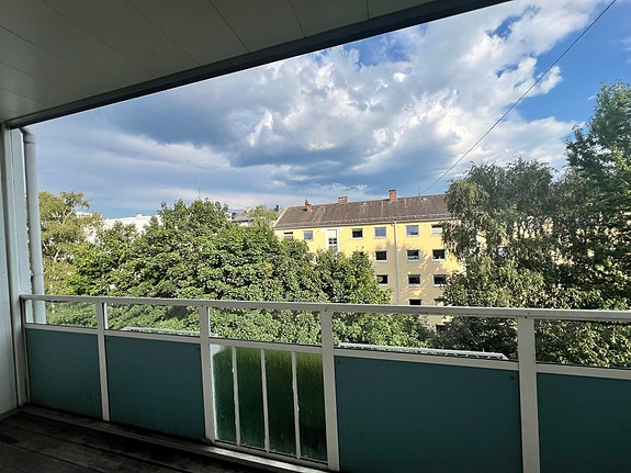 Leiligheten er gjennomgående og har en stor balkong med gode solforhold. Balkongen vender inn mot et stille området og mot naboblokken. Det er to romslige soverom, moderne bad og kjøkken som er separat med mulighet med dør. Romslig gang. Det følger med to kjeller boder av ulik størrelse, samt en stor loftsbod. Rolig nabolag. Leiligheten leies ut umøblert med unntak av et stort Jutzler garderobeskap med speil på det ene soverommet.