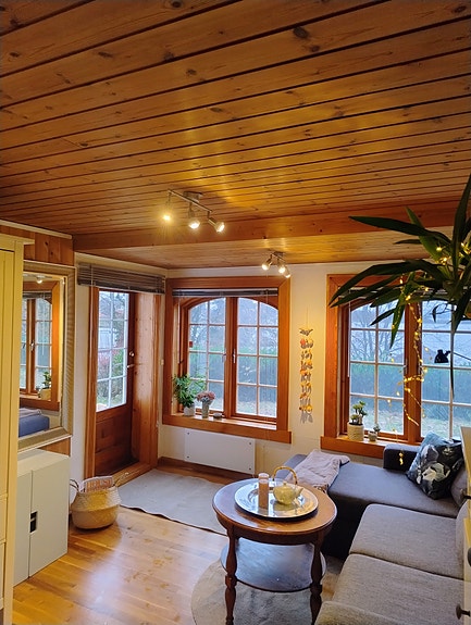 Møblert ; 2 stk sofa, Ikea madrass, skrivebord, hyller og reoler. Spisebord 4 stoler og sidebord. 2 kjøleskap og fryser, vaskemaskin og oppvaskmaskin. Peis for oppvarming og kos. Kjøkken har alt som behøves av utstyr. Villavent ventilasjons anlegg og aircondition. Eikegulv, eik møblert og pusset/oljet, nymalt og steam vasket ferdig til innflytting. Passer best for en person med fast arbeid og sikkerhet for langtids leietaker. Orden og noen som holder rent og ryddig.