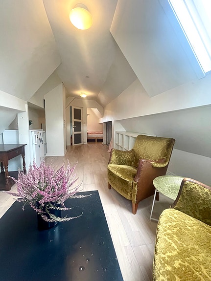 Sentralt og rolig beliggende bofellesskap. Romslig loftsrom med egen sovealkove og kjokkenkrok. Felles kjokken og bad I 2 .etg, 3 beboere totalt.