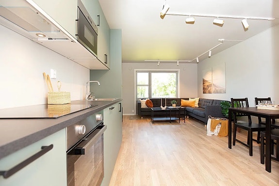 Vi møblerer kjøkkenet med alt av hvitevarer, kjøleskap med frys, oppvaskmaskin, stekeovn og mikrobølgeovn.