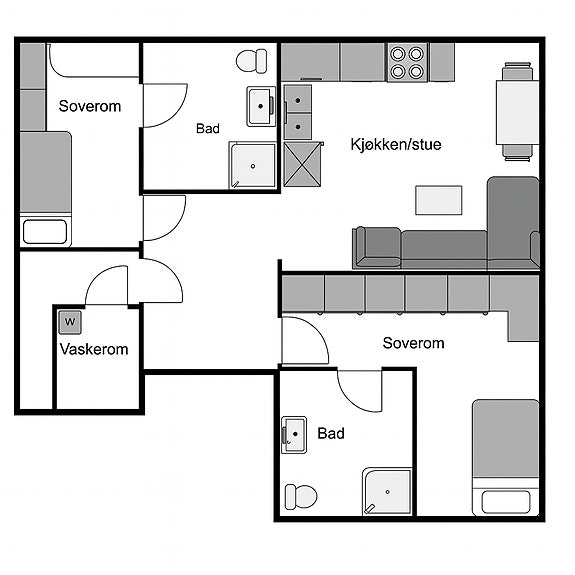 -Det er to soverom, med hvert sitt separate bad. Kjøkken og stue i åpen løsning.