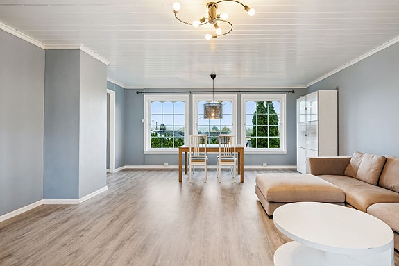 Lys og åpen stue/spisestue med delvis adkomst til kjøkken og utgang til en stor terrasse.