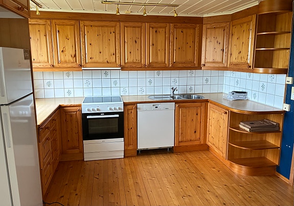 Åpen stue/kjøkkenløsning med peisovn, komfyr/stekeovn, avtrekksvifte, oppvaskmaskin og kombinert kjøl/frys
