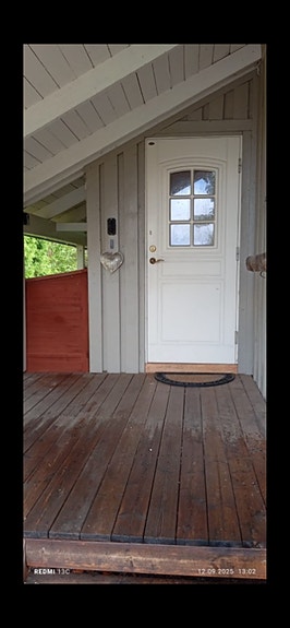 - Stor grøn plen og platting rundt hele huset. Det er også benk og sitteplasser under tak på verandaen.