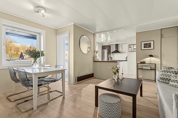 • Plass til både sofa, sofabord og spisebord med fire stoler