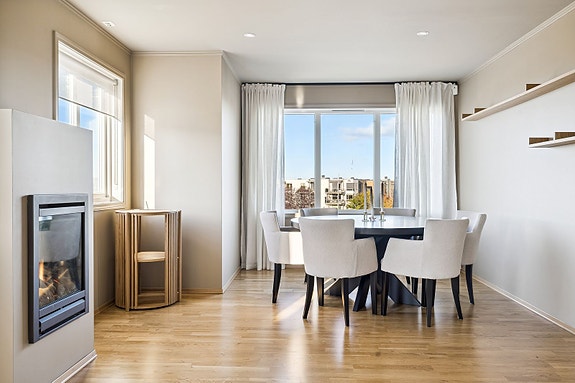 Boligen har balkong, peis/ildsted, utsikt, moderne, badstu, alarm.