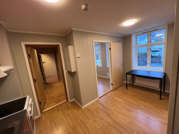 Boligen inneholder vindfang/gang, kjøkken, spiseplass, bad, og 2 soverom