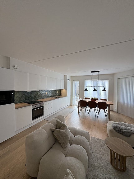 Dette er en lekker 3-roms leilighet på 90kvm beliggende i 3.etg. Leiligheten ligger i blokkens 3.etasje og er en hjørneleilighet. Denne leiligheten har 2 soverom hvor hovedsoverommet har eget bad og en god garderobe. Leiligheten har et stort kjøkken med integrerte hvitevarer og bant annet 2 kombiskap. Kjøkkenet er i en åpen stue/kjøkken løsning slik at romfølelsen er god og luftig. Stuen er romslig med moderne møbler og en stor TV samt en fin spisegruppe. Videre er det et flott flislagt bad i god størrelse med innfellbare dusjvegger, servantskap, vegghengt toalett, vaskemaskin og tørketrommel. Boligen har 2 soveorm. Hovedsoverommet er av veldig god størrelse og har en stor garderobe samt eget bad. Soverom 2 er også romslig og har plass til nødvendige møbler. Inkludert i leien er både internett, oppvarming fra vannbåren varme og varmtvann.