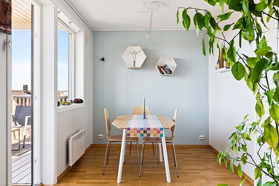 Det medfølger en egen parkeringsplass og en utvendig bod.