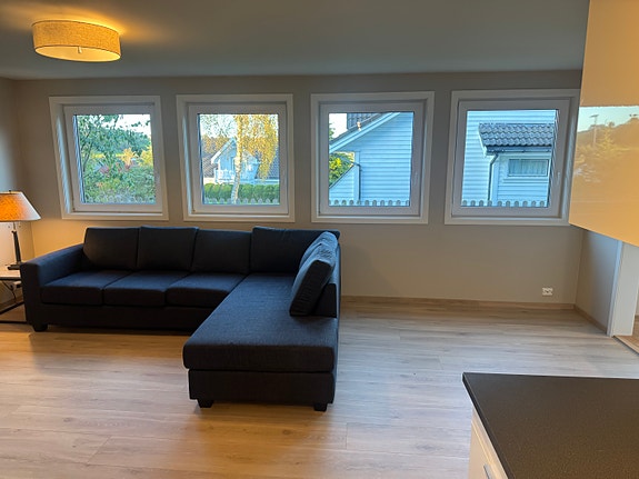 4 store vinduer som gir godt lys. Gardiner kommer opp i morgen