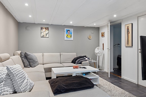 Koselig stue med dowlights og god plass til sofa og TV løsning