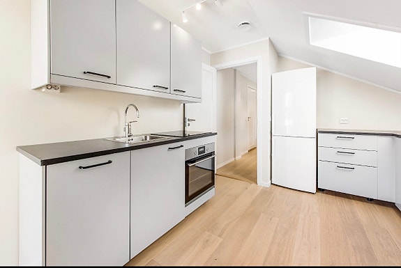 Eget adskilt kjøkken med hvitevarer, kjøleskap og oppvaskmaskin. Pent flislagt bad med vaskemaskin. Det er vannbåren varme i alle rom i hele leiligheten samt eget moderne balansert ventilasjonsanlegg i de enkelte rommene. Det er flott parkett i alle rommene. Downlights lys i stue og bad - spotlights i soverom, kjøkken og stue.