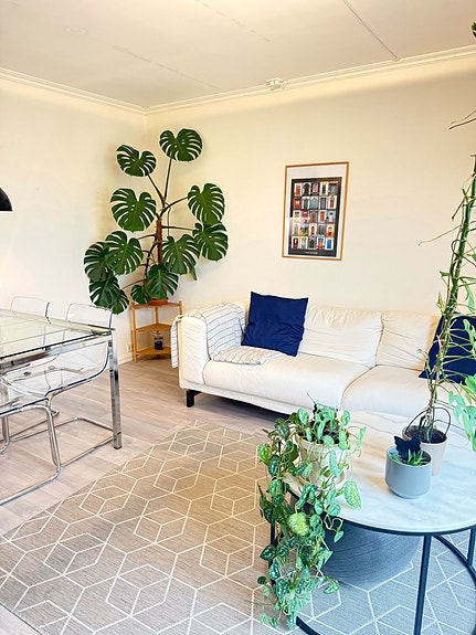 Stuen oppleves som lys og luftig med både sofagruppe og spisebord. Vinduer og balkongdør ut til fransk balkong som slipper inn rikelig med dagslys spesielt på ettermiddagen.