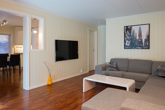 Lys og praktisk stue. Det er lagt nytt gulv i stue og kjøkken i 2022. Fargen på dette er lys grå i motsetning til det mørke gulvet som vises på bildene.