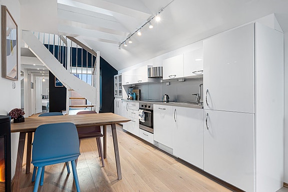 Kjøkken med spiseplass. Trapp opp til takterrasse