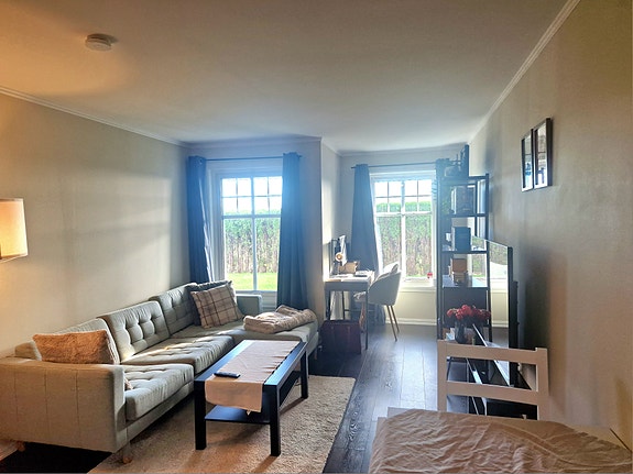 Lys stue med åpenkjøkken og hvitevarer (komfyr, kombikjøleskap).