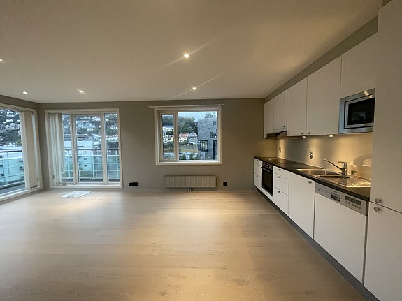 En har utgang til terrasse fra stue, her har en utsikt mot Fløyen og Ulriken, samt sjøgløtt mot store Lungegårdsvannet.