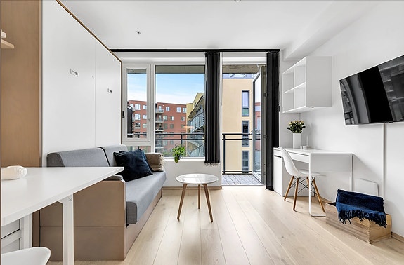 Moderne og møblert 1-roms leilighet med balkong – alt inkludert!