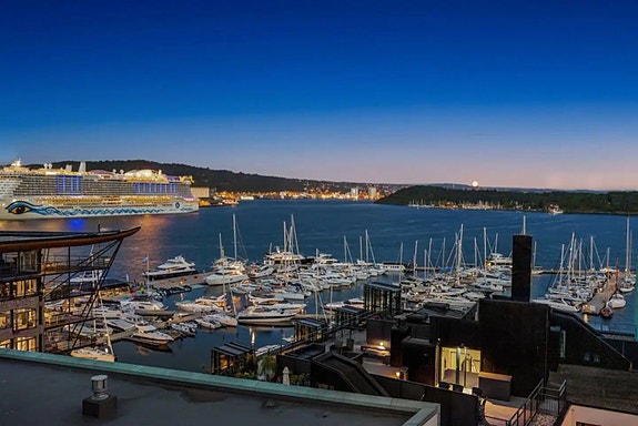 Felles takterrasse med panoramautsikt over Oslofjorden, byen, Holmenkollen og Aker Brygge Marina