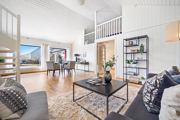 Huset har en åpen og lys planløsning med store vindusflater som slipper inn rikelig med dagslys. Stuen har god plass til både sittegruppe og spisebord, og en hems gir ekstra rom for lek, oppbevaring eller kontor – perfekt for barnefamilier. Peis gir lun stemning på kjølige kvelder, og utgang til terrasse gjør det enkelt å nyte fine sommerdager.
