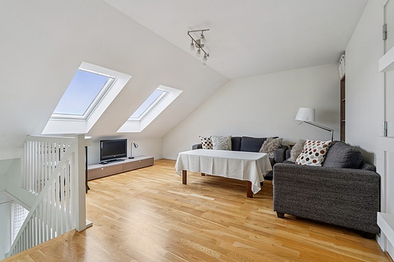 Opp trappen kommer du til en koselig loftsstue med store takvinduer som slipper inn rikelig med naturlig lys. Herfra har du utsikt mot himmelen og en følelse av å være skjermet og privat. Loftsetasjen har ytterligere to soverom, begge med god plass og store takvinduer, som gir en lys og luftig atmosfære. Her oppe finner du også et ekstra bad – ideelt for en stor husholdning eller for å gi gjester sin egen sone.