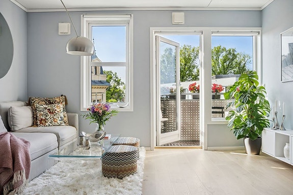 Stor stue med sofa, stuebord og spisebord. Utgang til solrik balkong fra stuen.