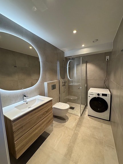 Flislagt bad med kombimaskin (vask/tørk), stort speil med LED-lys fra Haven og baderomsmøbler fra VikingBad, vegghengt toalett, romslig dusj med glassvegger og regndusj.