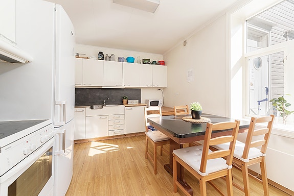 Koselig bofellesskap for 4 stk. Felles kjøkken med oppvaskmaskin, komfyr, kombiskap. Kjøkkenbord med stoler.