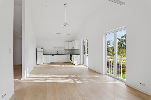 Åpen stue- og kjøkken løsning. Kjøkkeninnredning i hvite fronter med god skap- og benkeplass og det du trenger av hvitevarer.