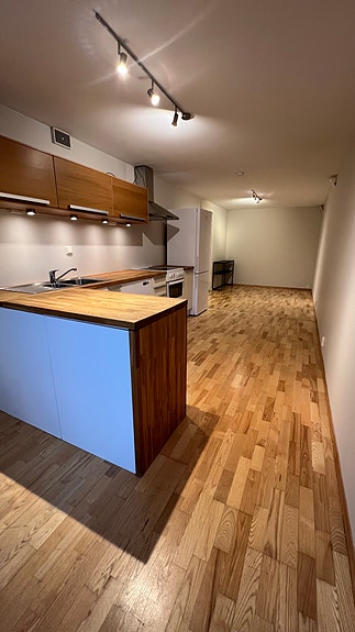Hybelen er umøblert foruten vaskemaskin, oppvaskmaskin, komfyr, kjøleskap og vegghengte skap i innredet rom som medfølger.