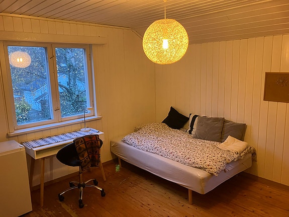 Lyst og koselig rom til leie i et hyggelig bofellesskap på Heimenveien i Kolbotn. Rommet er møblert med seng, skrivebord, stol og garderobeskap – klart til innflytting. Det har store vinduer med utsikt mot trærne og gir en lun og rolig atmosfære, perfekt for studenter eller unge yrkesaktive.