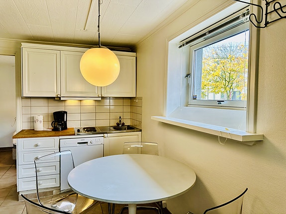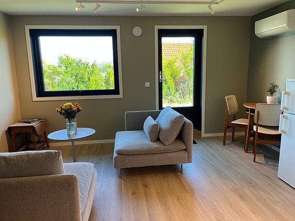 Lys ,godkjent ,fullt møblert sokkelleil i roligt villaområde