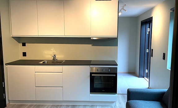Hybelen inneholder stue/kjøkken med integrerte hvitevarer (foruten kjøleskap), flislagt gang m/varmekabler, sovealkove og bad med opplegg til vaskemaskin, totalt 32 kvm.