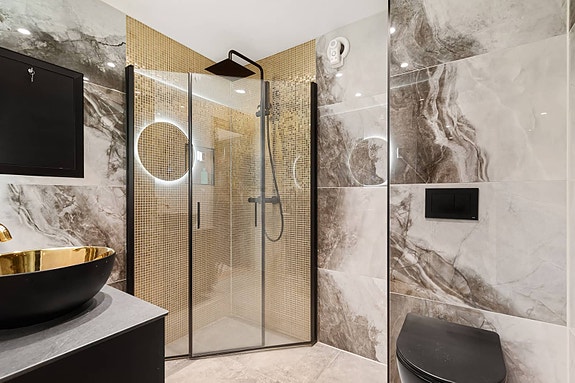 Badet har i tillegg vegghengt WC og waterguard/lekkasjestopper installert