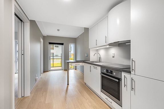 Gang med plass til garderobeskap. Lekkert flislagt bad med opplegg til vaskemaskin. Kjøkken med hvite glatte fronter og integrerte hvitevarer. Soverom med garderobeskap og plass til dobbelseng.