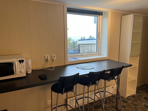 Kjøkkenet har OPPVASKMASKIN, komfyr, mikrobølgeovn, vannkoker, kaffetrakter, kombiskap frys/kjøl, benk med barstoler, hylle, skap, puff, samt utstyr som kasserolle/panne, fat, glass, kopper, bestikk og redskaper. Badet har toalett, servant/skap, dusjkabinett og vaskemaskin. Soverommet har 1 stk 90x200 seng, garderobeskap og nattbord m/skuffer, recliner og hylle/romdeler. Interiøret tilhører hybelen og skal stå der.