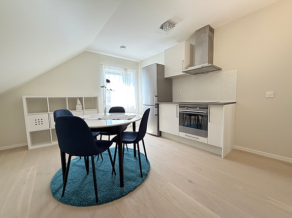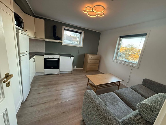 Leiligheten leies ut helt ferdig møblert med sofa, seng og kjøkkenutstyr. Har satt opp skrivepult på soverommet og har en stor hjemmekino i stua. Dette medfølger dessverre ikke og vil bli fjernet før innflytting. Boden leies ikke ut.