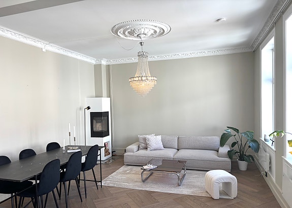 Lys, stilren, nyrenovert klassisk leilighet med god takhøyde, peis og fiskebeinsparkett. Leiligheten leies ut møblert med utstyrt kjøkken og the Frame TV. En av kvalitetene til denne leiligheten er at den er helt stille :) kan leies ut både møblert og umøblert.