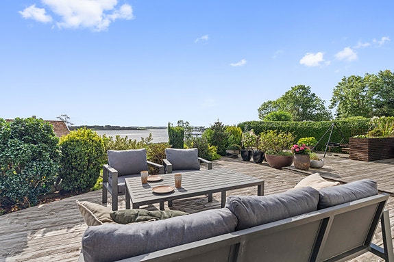 Utgang til balkong med nydelig sjøutsikt, med trapp ned til terrasse