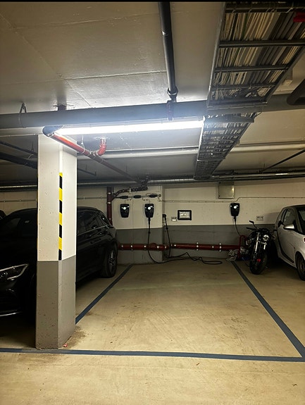Parkeringsplass i lukket bakgård sentralt i Welhavens Gate leies ut. Er installert ladeboks på plassen. Port kan åpnes med app.