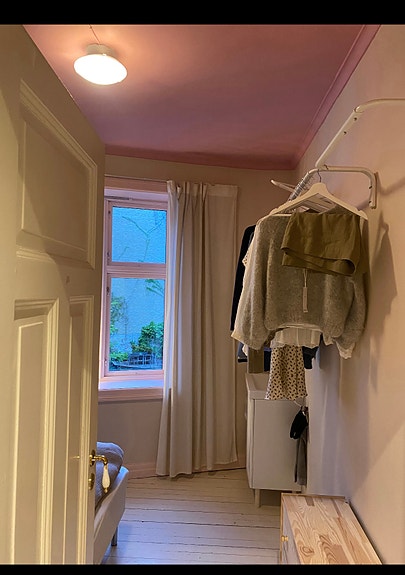 Rommet er lyst, pent og veldig rolig, med utsikt mot en fin og skjermet bakgård. Det leies ut møblert med seng og speil, og du får i tillegg et ekstra skap til oppbevaring ute i gangen. Det er derfor god plass til eiendelene dine selv om rommet er kompakt.