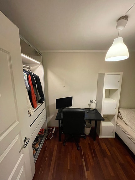 Rommet er 9 m2 i en leilighet på ca 76 m2 som deles med to andre. Felles bad, kjøkken, stue og balkong. Leiligheten disponerer tre boder. Rommet er møblert med 140 seng, pult og stort skap. Fellesarealene har møbler og utstyr.